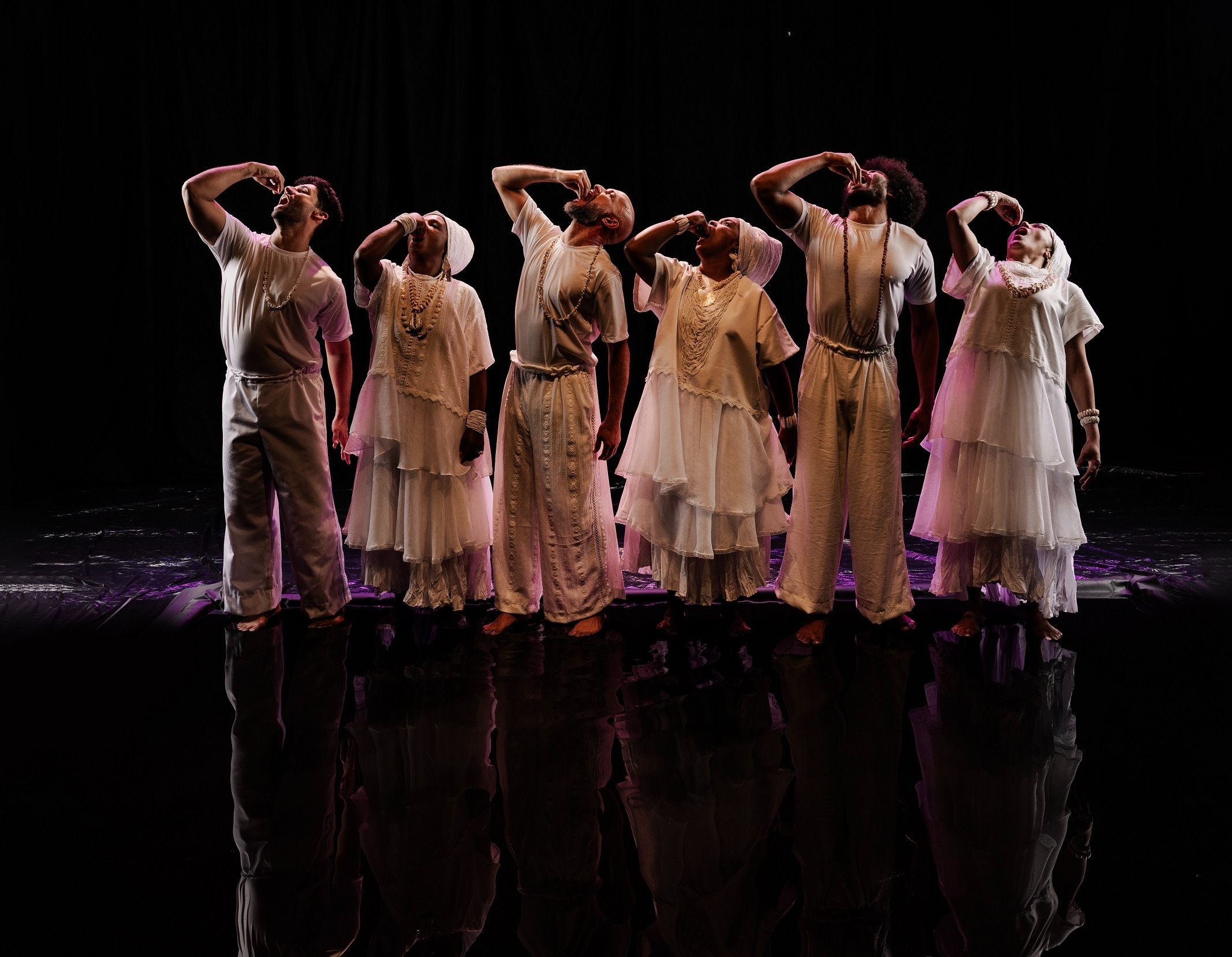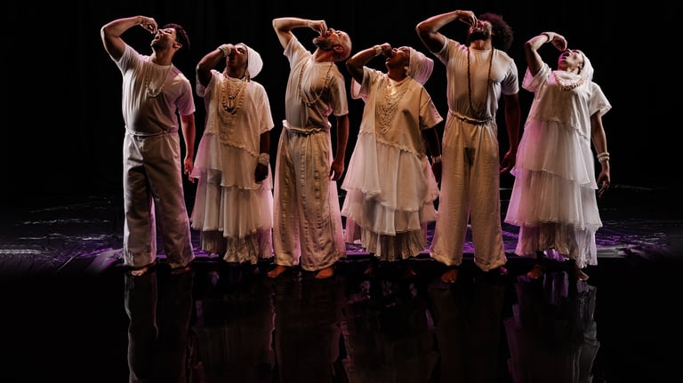 Por meio de uma encenação simbólica construída sobre um espelho d’água — cenografia de Telumi Hellen —, o espetáculo propõe uma metáfora visual para o desaguar da vida pós-prisão: a água que purifica, mas também carrega a força de memórias e afetos. Exu, orixá das encruzilhadas, surge como entidade provocadora, despertando o desejo por recomeços e a fome por dignidade.